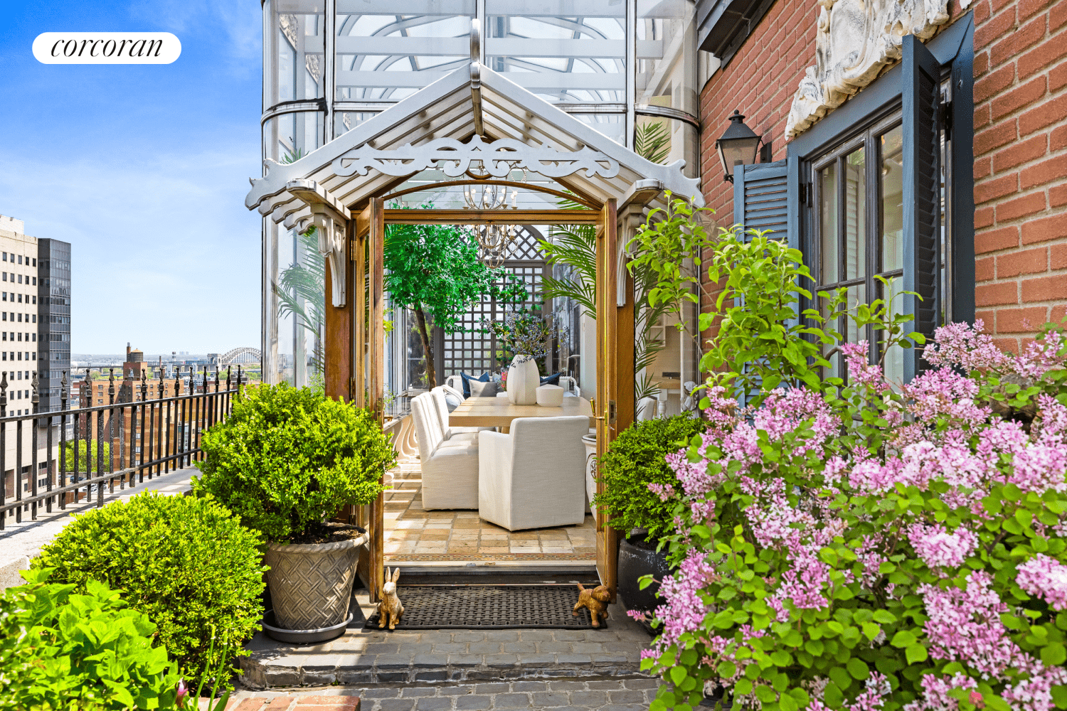 Ascend the stairs or take your private elevator to the Penthouse level, which boasts the most exquisite glass solarium available on Fifth Avenue! This elegant glass and steel structure sets the stage for the home's formal dining room. It's an unparalleled space to host dinner parties, and a casual seating area within the solarium offers a relaxed setting for everyday meals.