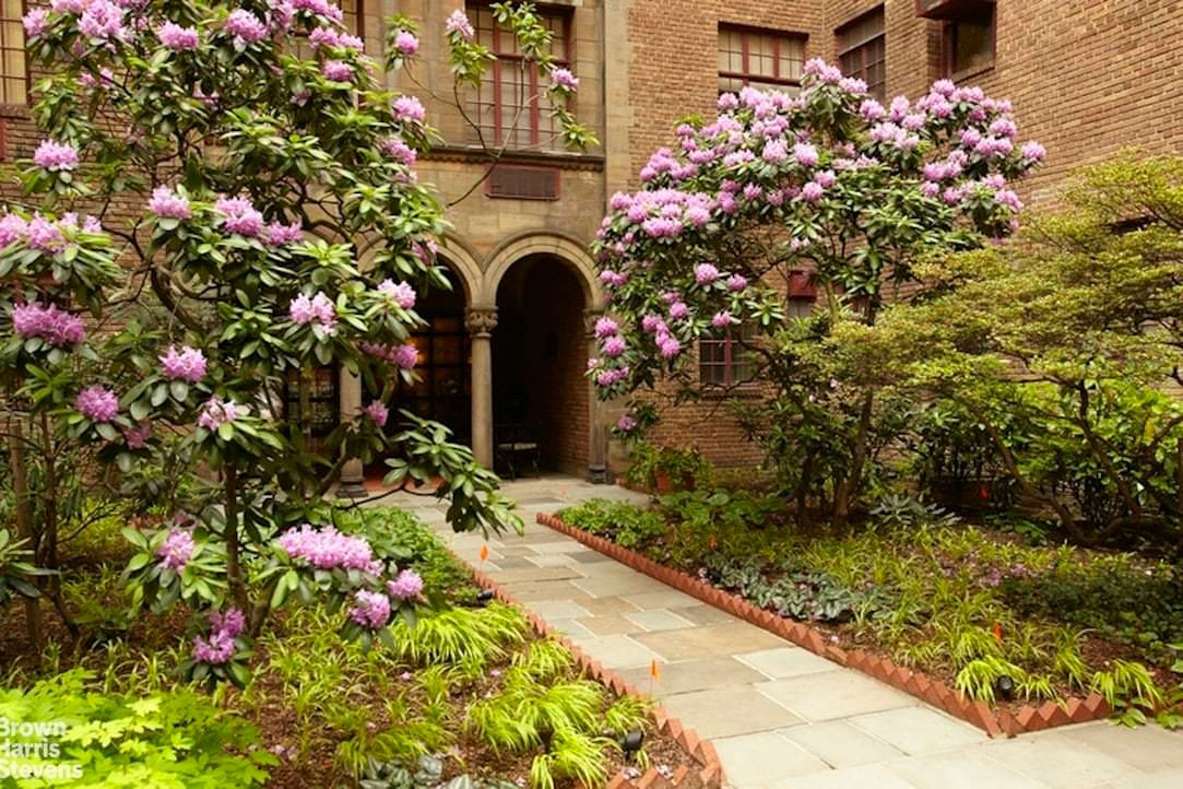 THE APARTMENT: Estate condition. Original classic six home, now five rooms, includes living room with wood-burning fireplace, formal dining room, two bedrooms each with en suite bath, eat-in-kitchen, powder room. Beautiful north and south light. Overlooks a fully planted garden. Offering includes two double staff rooms, each with bath, on the lobby level. (For each double staff room, there are 54 shares and additional maintenance of $984.)