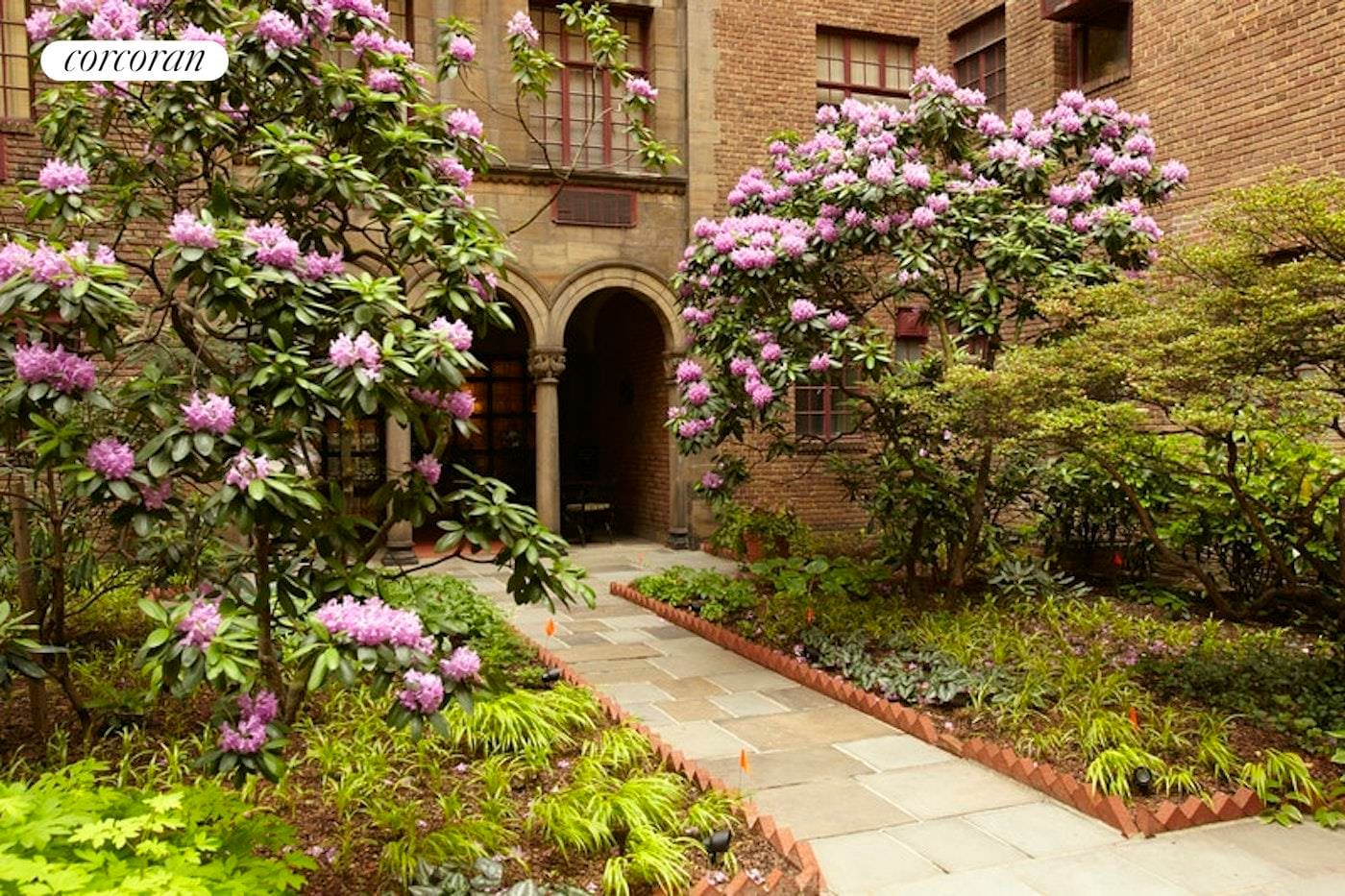 THE APARTMENT: Estate condition. Original classic six home, now five rooms, includes living room with wood-burning fireplace, formal dining room, two bedrooms each with ensuite bath, eat-in-kitchen, powder room. Beautiful north and south light. Overlooks a fully planted garden. Offering includes two double staff rooms with baths on lobby level. (For each double staff room, there are 54 shares and additional maintenance of 984 dollars)