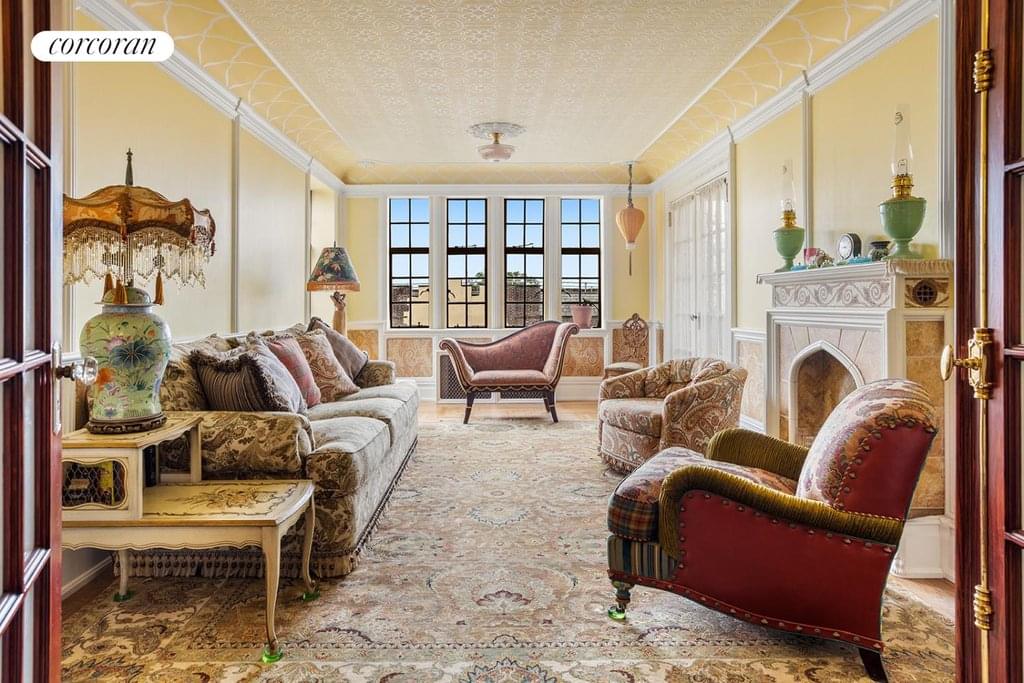 One set of French doors leads you into the bright and cheery living room with its abundant fenestration that includes a corner of windows with slate sills, offering two exposures bringing soft northern light and a western window for Hudson River views, fresh cross breezes, a dream home for plants while giving you the feeling of an airy perch above the fray. Handsome moldings wind around the walls to frame fabric wainscoting and provide picture rails for wall hangings. The periphery of the patterned ceiling is coved and illuminated transforming this spacious room from a bright gathering spot by day into a romantic hideaway at night, complete with a built-in bookcase, tiled candle hearth, and refinished oak parquet floors spanning the entire apartment.