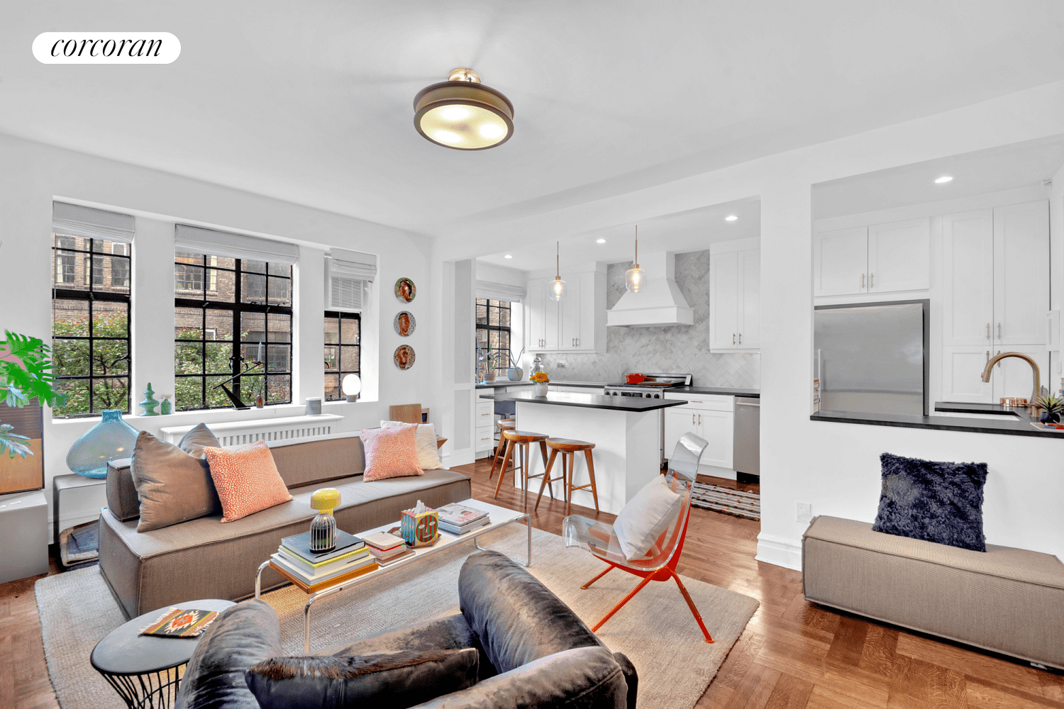 As you enter this lovely one-bedroom home at Hudson View Gardens, you are welcomed into an elegant gallery hall that leads into a masterfully designed open kitchen and spacious living room overlooking the landscaped gardens. Facing west, both the living room and the renovated kitchen is a spectacular space for gatherings. If you are not a chef already, you certainly well become one with this well-equipped kitchen that features stainless steel appliances (stove, fridge, DW). There are ample soapstone counter-spaces for prep, including a sizeable island that could serve as a dining table, and loads of pristine white cabinets for storage. The living room is spacious and airy with an alcove space that could play many roles: it could easily be a sizeable home office, a walk-in closet, or opened to enlarge the living room. The large bedroom has two exposures with great light (south and west), with plenty of room for storage with two generously sized closets. There are 6 closets total, with the addition of the alcove in the living room. The updated bathroom is in excellent condition. The apartment has so many wonderful features that you must visit to appreciate. Located on the second floor in the elevatored buildings. The monthly maintenance is $1,650.88, which includes G&S; there is an additional on-going capital assessment of $278.06/month, and the AC surcharge for 2 units total $59.51/month. Pet-friendly.