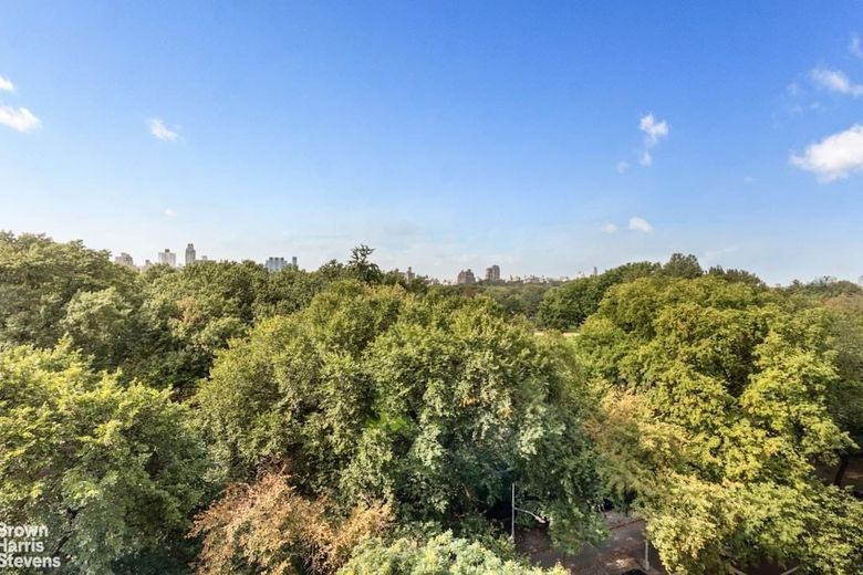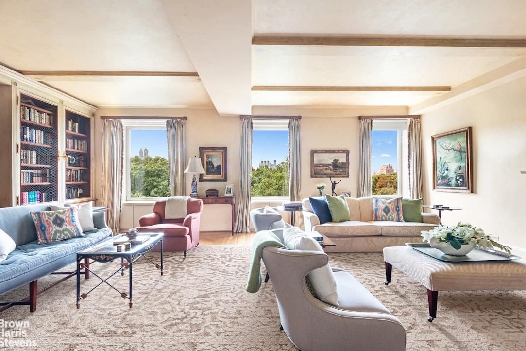 From the semi-private elevator vestibule one enters into the 22 foot long gallery, off which every major room emanates. The sun-flooded double living room (nearly 26 feet wide) with its enormous windows immediately draws you in. The living room features a high-beamed ceiling and a wood-burning fireplace. The formal dining room faces South with views of the midtown skyline. The corner primary bedroom and the second bedroom, each with their own bath ensuite are located off their own bedroom hallway. Wake up with the lush greenery from Central Park, a view almost directly across from the Eldorado, or perhaps spot a hawk soaring by...