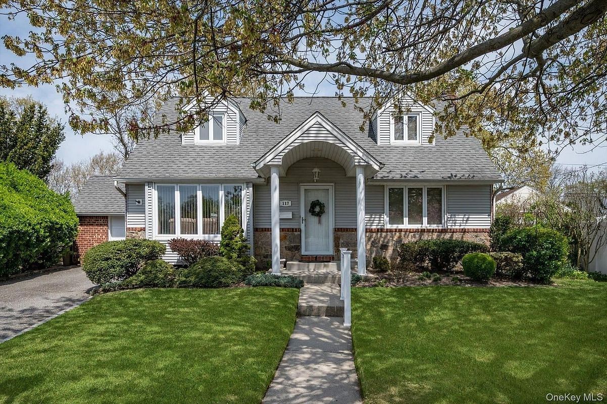 Welcome to this beautifully maintained and expanded cape, ideally situated mid-block on a quiet street in the heart of East Meadow. Set on an oversized lot, this charming home features an inviting front portico that creates a warm first impression. Inside, you'll find an open-concept living and dining area that flows seamlessly into the kitchen, complete with granite countertops, abundant cabinetry, a new black stainless steel refrigerator, and a wall of windows offering stunning views of the expansive, park-like backyard. The first floor includes two generously sized bedrooms and a full bathroom. Upstairs, you'll find two additional spacious bedrooms, another full bath, and generous closet space. Additional highlights include a full basement with endless potential, gas heating, 200-amp electric service, and a ductless air unit for added comfort.