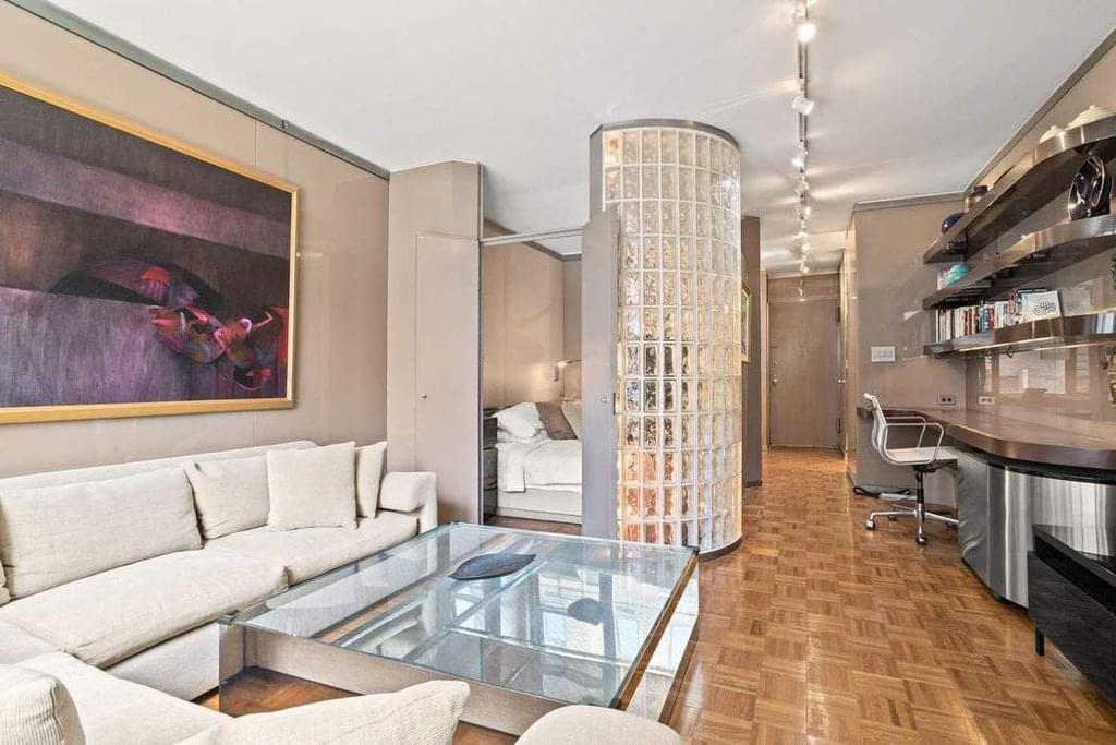 The brilliant architect created all the different areas using a beautiful combination of glass walls and glass blocks. The perfectly conceived floorplan includes: a spacious living room by the windows, a large and efficient home office with shelves and storage to accommodate your book collection and files, a cozy dining area conveniently located right off the kitchen, and a super comfortable queen size sleeping area that can be completely closed-in for privacy.