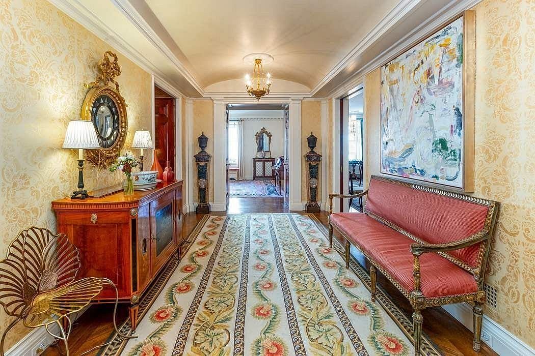 A private bedroom hallway leads to the four bedrooms; the primary a luxurious suite with fireplace, large dressing room, ample fitted closets and a sizable marble bathroom. Three additional, generously sized bedrooms and two bathrooms complete this wing. All of the bedrooms face Park Avenue and are bathed in western light.