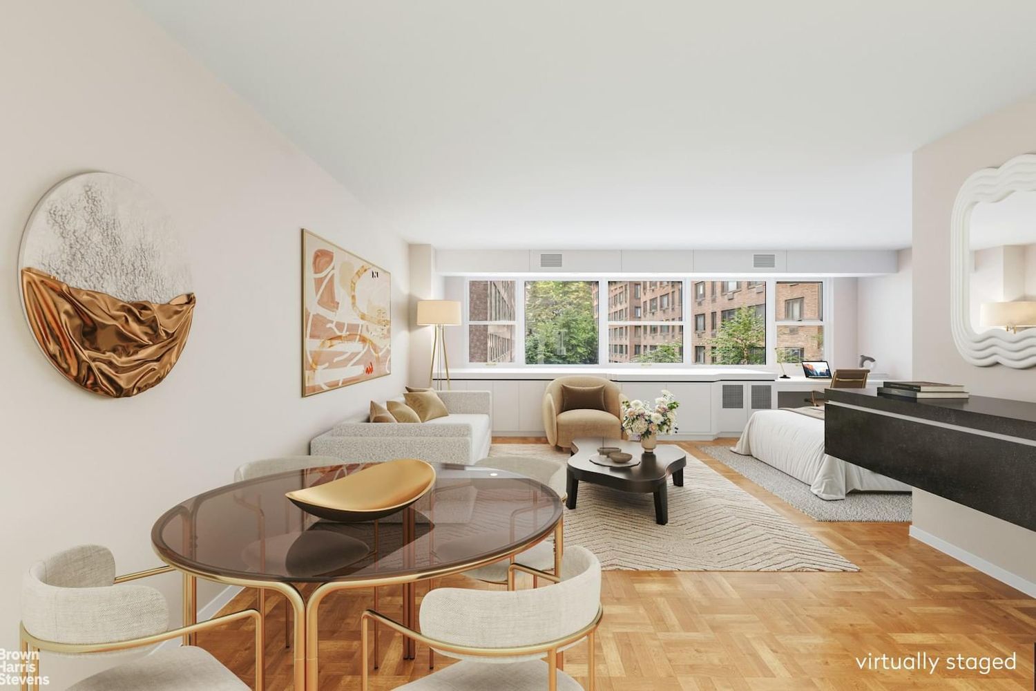 Super spacious large alcove can be closed to accommodate a large sleeping area which is actually a good sized bedroom with 2 closets and its own heating and a/c system. This lovely home or pied a terre faces west with tons of afternoon sun and a lovely view of both the sky and the building gardens below. A full-sized separate kitchen and tons of closets.
