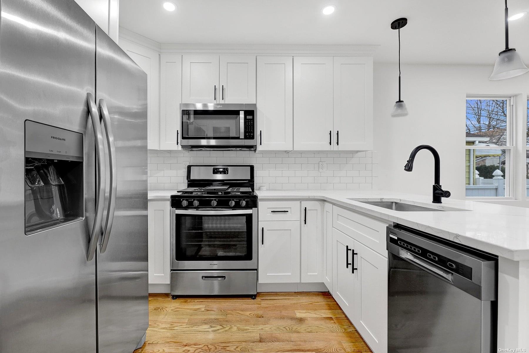Space, style & modern luxury come together in this newly renovated single family. Nestled on a beautiful tree lined street featuring a wide private driveway & garage. Open the door and enter an expansive sun drenched living/dining area which provides great space for entertaining. Beautiful chefs granite kitchen equipped with floor to ceiling custom cabinetry, adorned with full sized stainless steel appliances & island for bar stool seating. Master suite on 1st floor with private en suite. 1/2 bath on first floor for your guest. Up a flight of stairs 3 spacious bedrooms awaits you, each equipped with ample closet space as well as a fully tiled bathroom. High ceiling full finished basement w/OSE. Brand new hardwood flooring, recessed lighting, electrical, heating & plumbing systems throughout. Prime Location! Stones throw to transportation, schools, shopping centers, highways, restaurants and many other vibrant neighborhood amenities.