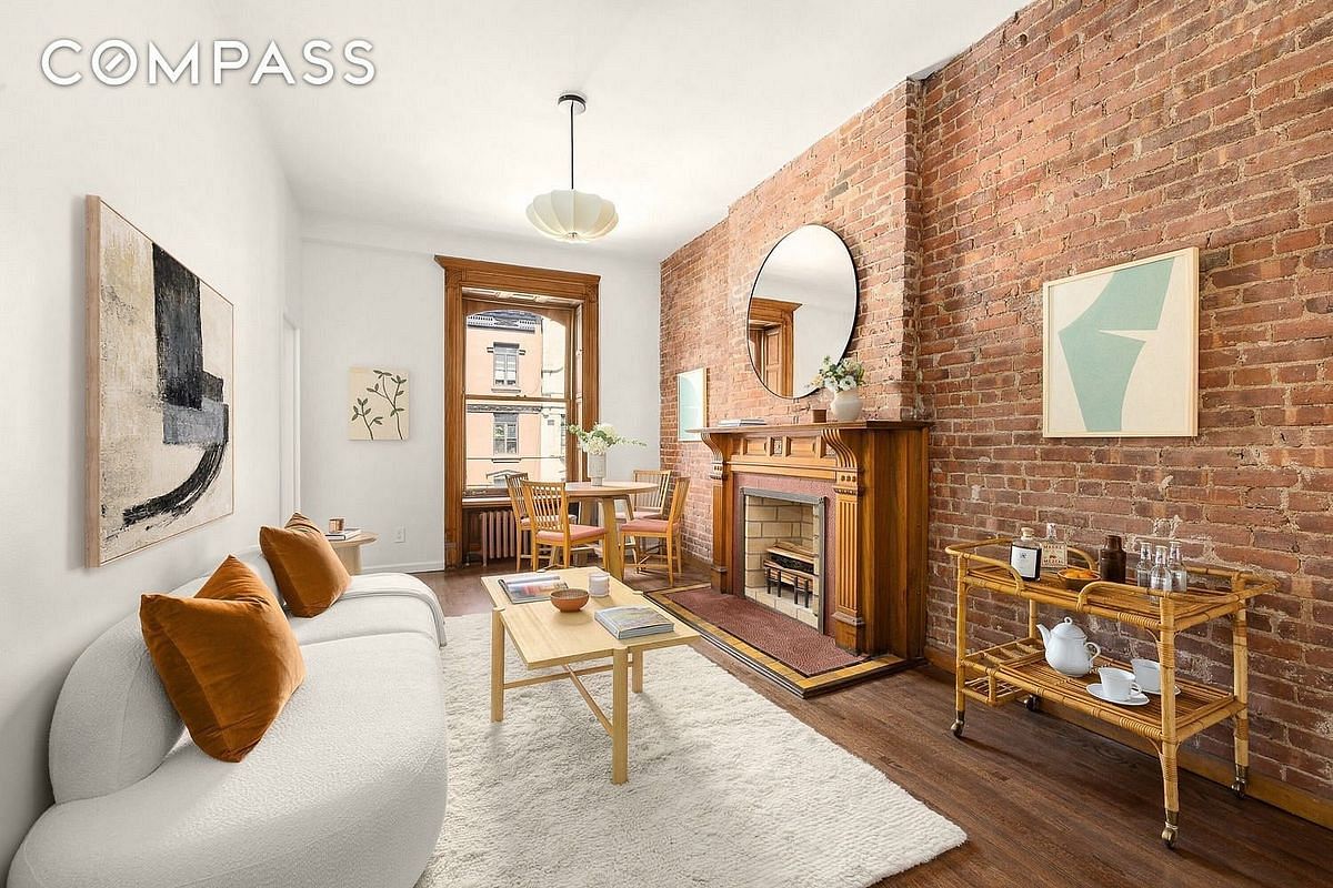 On the third floor of a charming brownstone co-op comes this fully renovated one-bedroom home with exposed brick, espresso-stained hardwood floors, and an original fireplace that sets the tone before you even set down your keys. Theres an easy warmth to this home that you feel the moment you enter, some homes try to manufacture character, this one has it built into the walls.