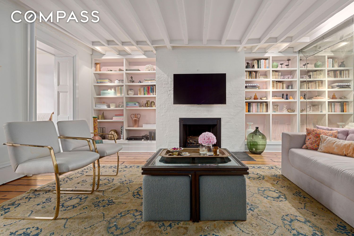 Arrive via the private front yard to your gated vestibule that leads to a spacious entry hallway housing two substantial closets, a laundry room with Bosch washer/dryer, and a pretty marble Water Works hall bath. The hallway leads to the oversized living room with its charming beamed ceiling and attractive built-ins flanking the stone hearth and decorative fireplace.
