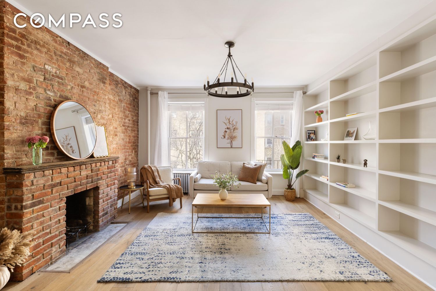 Bathed in natural light, the sun-drenched living room showcases a working wood-burning fireplace, framed by original exposed brick that extends dramatically across an entire wall. Custom built-in shelving provides both storage and display space, while newly installed wide-plank oak flooring flows seamlessly throughout the apartment.