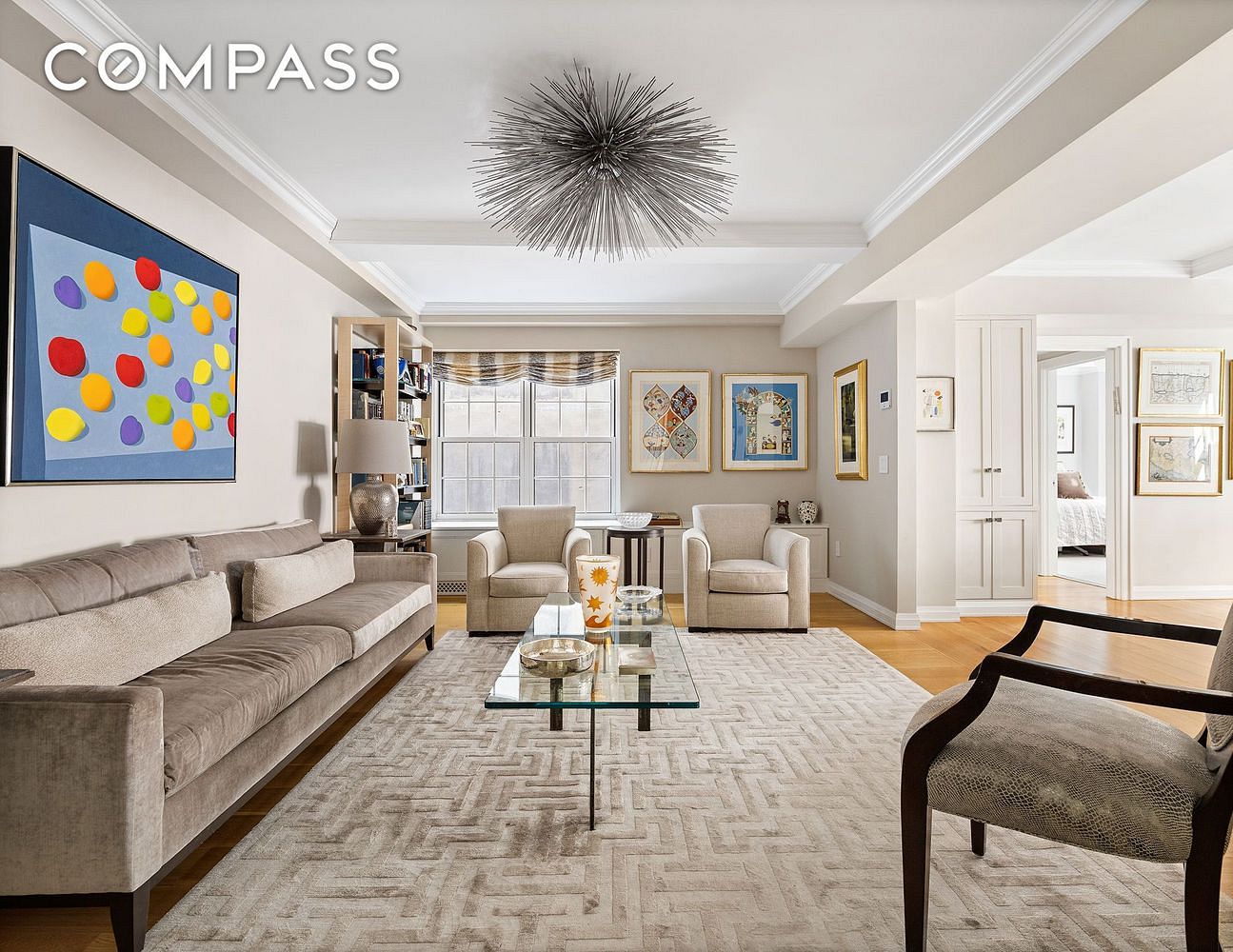 A gracious entry gallery welcomes you where you are drawn to an expansive sunken living and dining room that blends classic pre-war interiors with a warm, organic, and chic contemporary palette with six-inch white oak plank floors throughout. The open chef's kitchen is outfitted with custom white cabinetry accented by polished nickel hardware and features under-cabinet lighting. Dekton Spanish Quartz countertops and backsplashes are perfectly complemented by Dornbracht polished chrome faucets and a full range of professional appliances including dual Miele Ovens, a Wolf range with a Miele hood, two Bosch dishwashers, and a 48" SubZero Fridge.