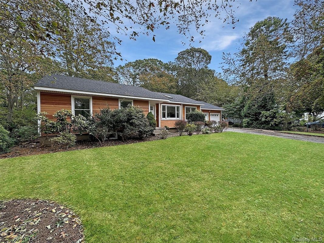Beautifully reimagined for 2025, this stylish ranch home offers the perfect blend of Hamptons charm and modern design. The open and sun-filled living room features cathedral ceilings, skylights, and refinished hardwood floors that flow seamlessly throughout. The designer kitchen boasts a spacious center island, sleek finishes, and modern appliances—ideal for everyday living and entertaining.