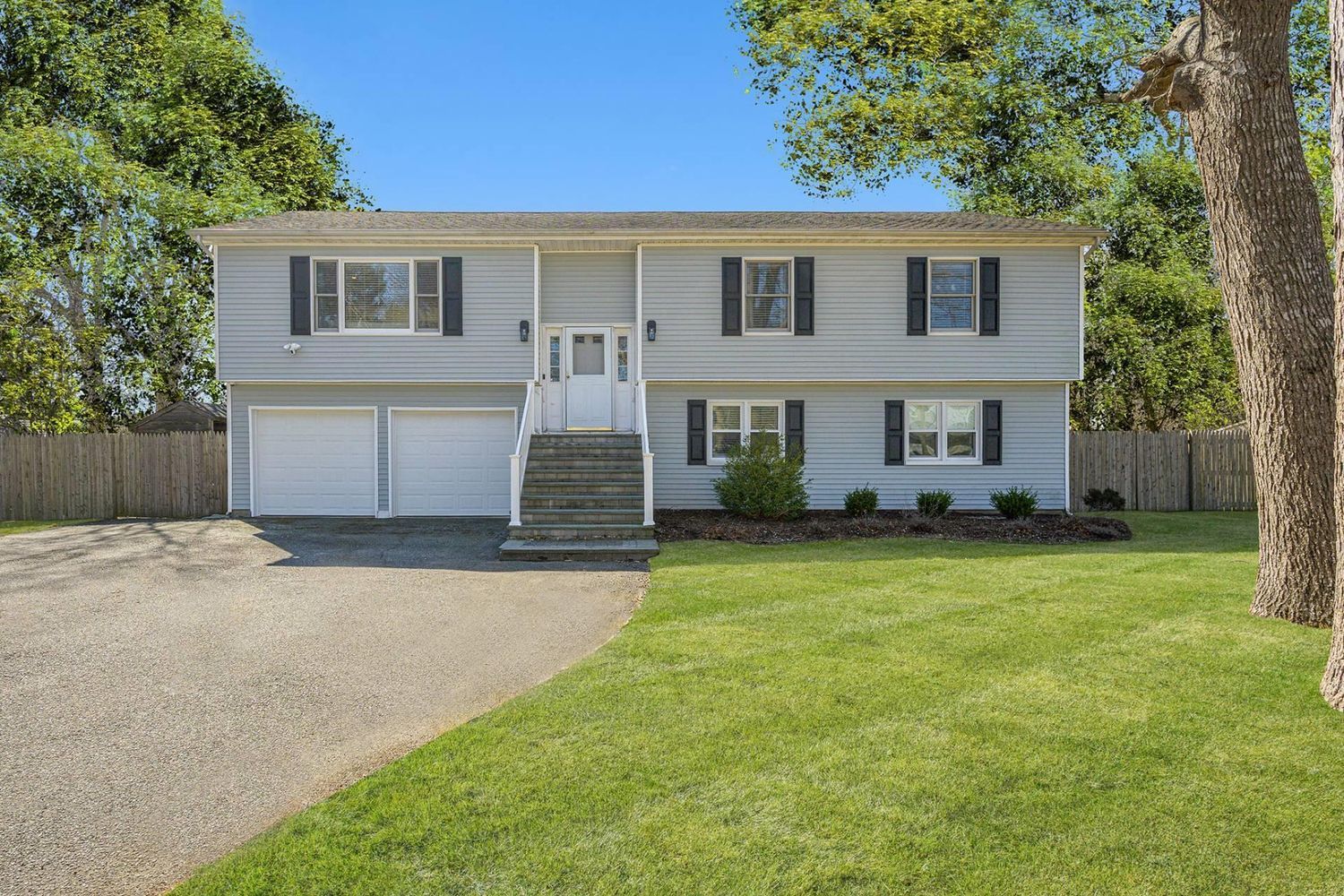 Nestled in the heart of Center Moriches, this beautifully updated high ranch presents a warm and inviting interior, combining for both comfort and convenience. Offering a generous 2,808 square feet of living space, this expansive 4-bedroom, 3.5-bathroom home sits gracefully on a 0.35-acre lot, with thoughtful renovations completed in 2020. Once inside you'll discover a bright and airy open-concept layout, with real hardwood floors throughout. The gourmet galley kitchen is equipped with modern appliances and ample cabinetry is perfect for entertaining. The spacious living and dining areas offers abundant natural light, creating a welcoming atmosphere. The primary bedroom includes an en suite bathroom, and there is a private guest room that adds an extra touch of privacy, while a convenient first-floor bathroom ensures ease of living. Designed with modern comfort in mind, this home features central air, a robust 200-amp electrical system, and dual heating and cooling zones for year-round relaxation. Property features a gated in-ground vinyl pool, surrounded by a large, fully fenced yard that provides the perfect backdrop for outdoor gatherings. Relax on the spacious deck or enjoy alfresco dining on the patio. The attached two-car garage offers ample storage and convenient parking. Ideally located just moments from the serene Webby's Beach, this great property offers the best of both tranquility and accessibility creating a perfect haven for those seeking a coastal lifestyle.