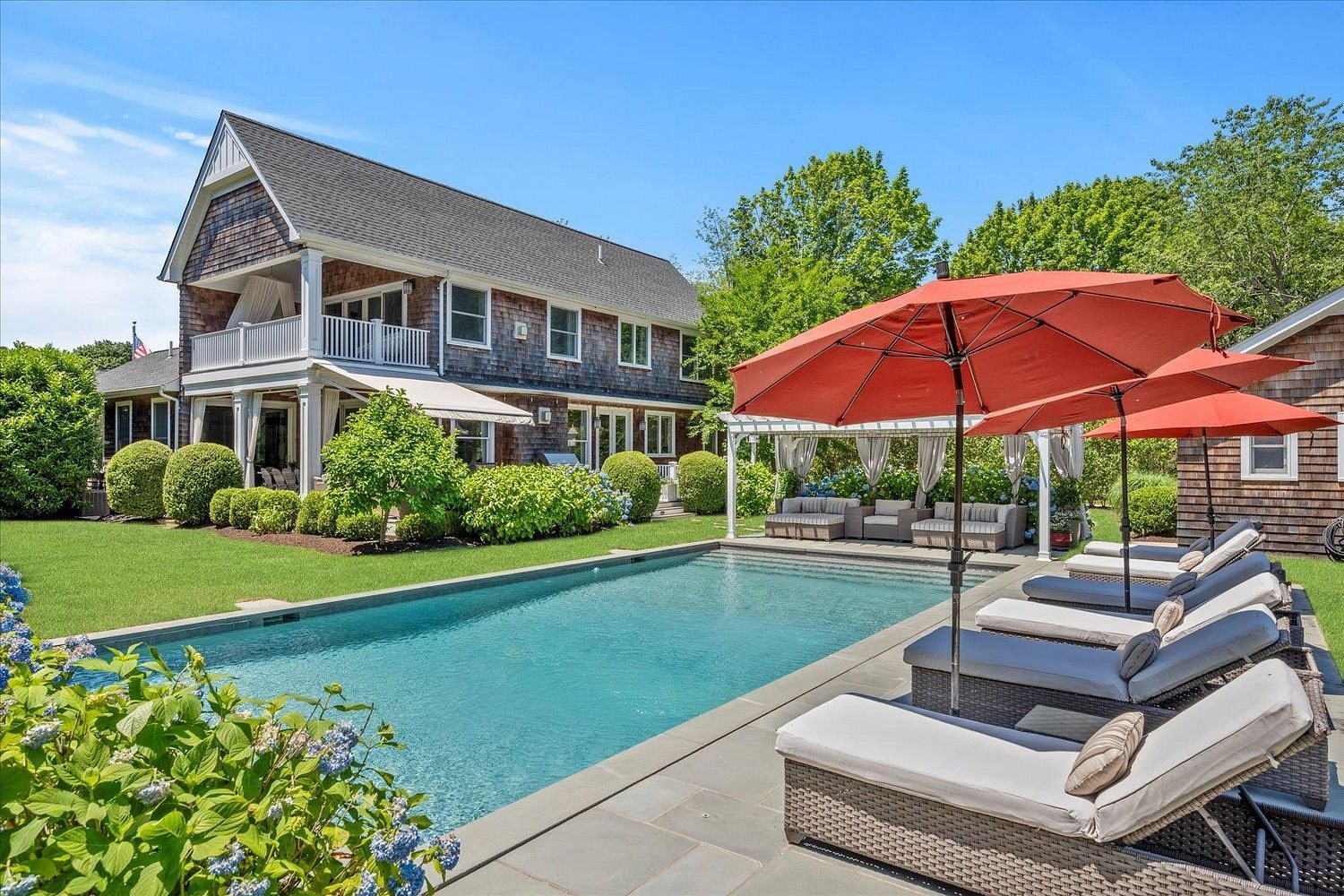 Set on a beautifully landscaped half-acre, this meticulously maintained property is designed for indoor-outdoor living. The open-concept interior is flooded with natural light from oversized windows that frame views of the expansive backyard oasis. Outside, enjoy a heated Gunite pool, outdoor shower, firepit lounge area, spacious deck with a seating area with a retractable awning, and a covered dining area ideal for al fresco entertaining.