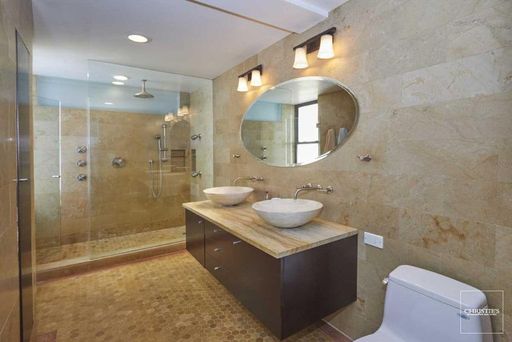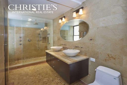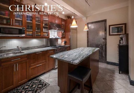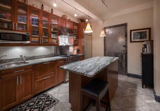 Bespoke materials distinguish this renovation, such as 'Crows Foot' schist from the Hudson Valley, Pietra Cardosa granite, fossilized Corton gold granite, and honed Satron gold stone. The dining area has a convenient built-in bar. There is generous storage space throughout, including a large pantry off the kitchen and laundry closet with washer/dryer. The kitchen is adorned with cherry cabinetry, a Sub-Zero fridge and wine fridge, Wolf stove, and convenient island. There are granite countertops and a glass backsplash. The corner primary bedroom is well-proportioned with a deep walk-in closet. The en suite bathroom has double sinks and a large walk-shower. Two additional bedrooms are sunny and amply-sized.