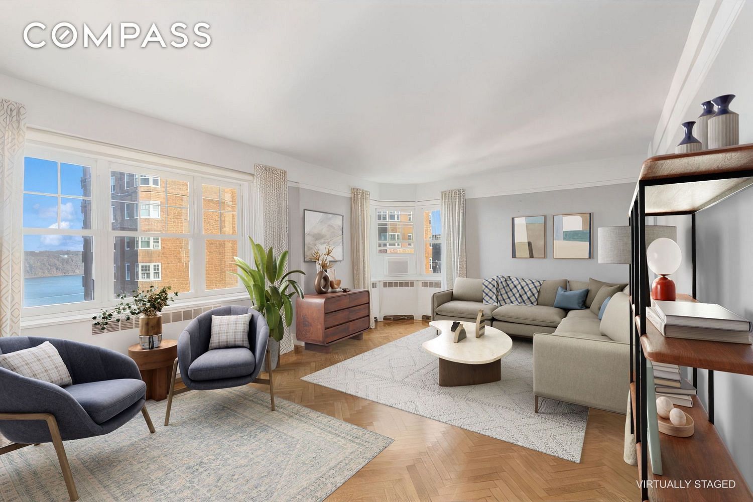 Enter and feel the serenity and calm that uniquely exists in Castle Village, the premier building in Hudson Heights. The expanse and wide-open views are a picture-perfect backdrop for this lovely high floor home perched above the Hudson River, Palisades and private gardens below.
