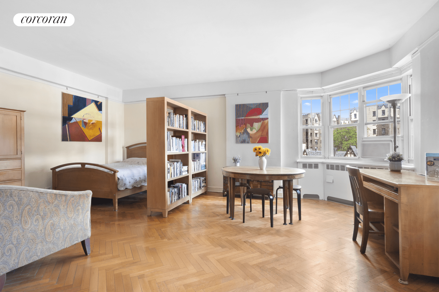 You haven't seen a Castle Village studio? Check this one out and be amazed. Apartment 95 is no shoebox. The total living area (19" x 13') can accommodate your couch, dining table, and desk, plus a generous sleeping area, with no overcrowding. The large east facing bay window emits excellent light all day. The windowed kitchen includes a small dining bar.
