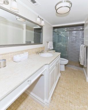 The bedroom, accessible through elegant French doors, also features custom built-ins, adding to the home's abundant storage options. The ensuite bathroom exudes a spa-like ambiance with its luxurious finishes, ensuring a serene retreat from the hustle and bustle of city life.