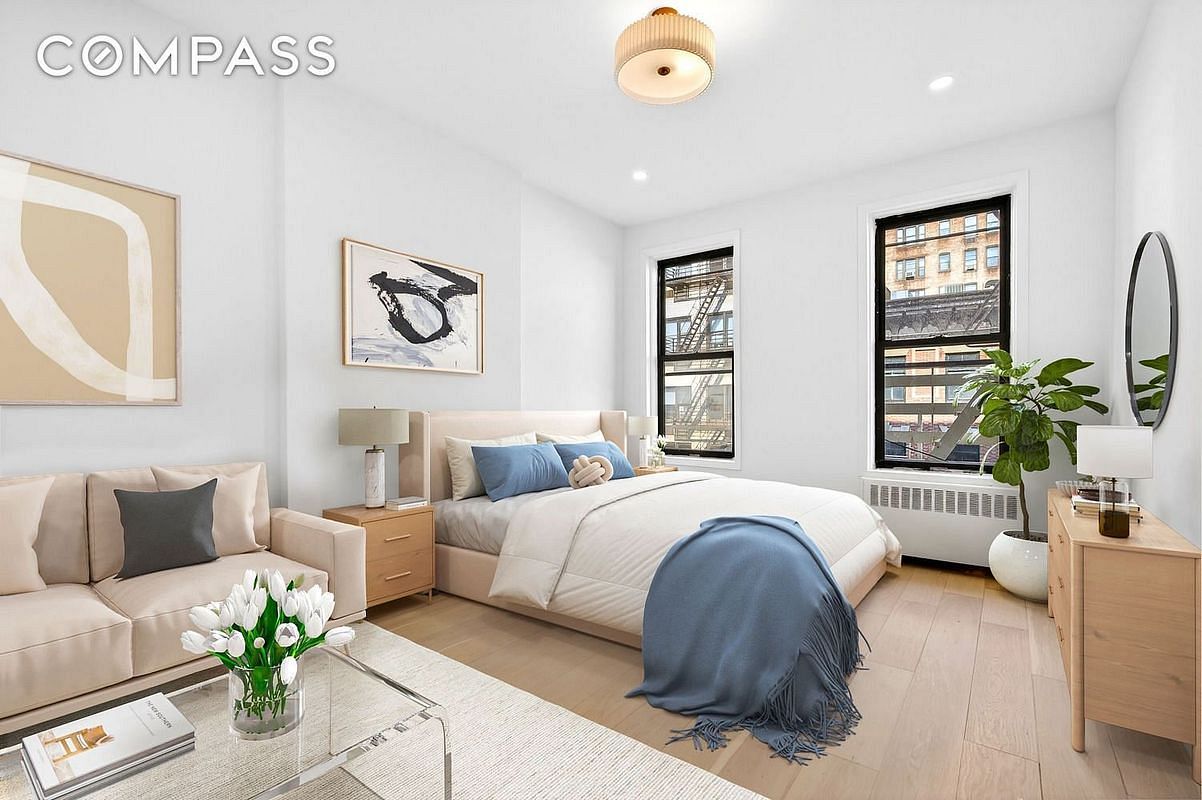 The windowed kitchen has been beautifully renovated with stainless steel appliances, including a gas range, dishwasher, and built-in microwave. Gorgeous floors run throughout, complemented by two generous storage closets and a luxurious windowed bathroom with high-end finishes.