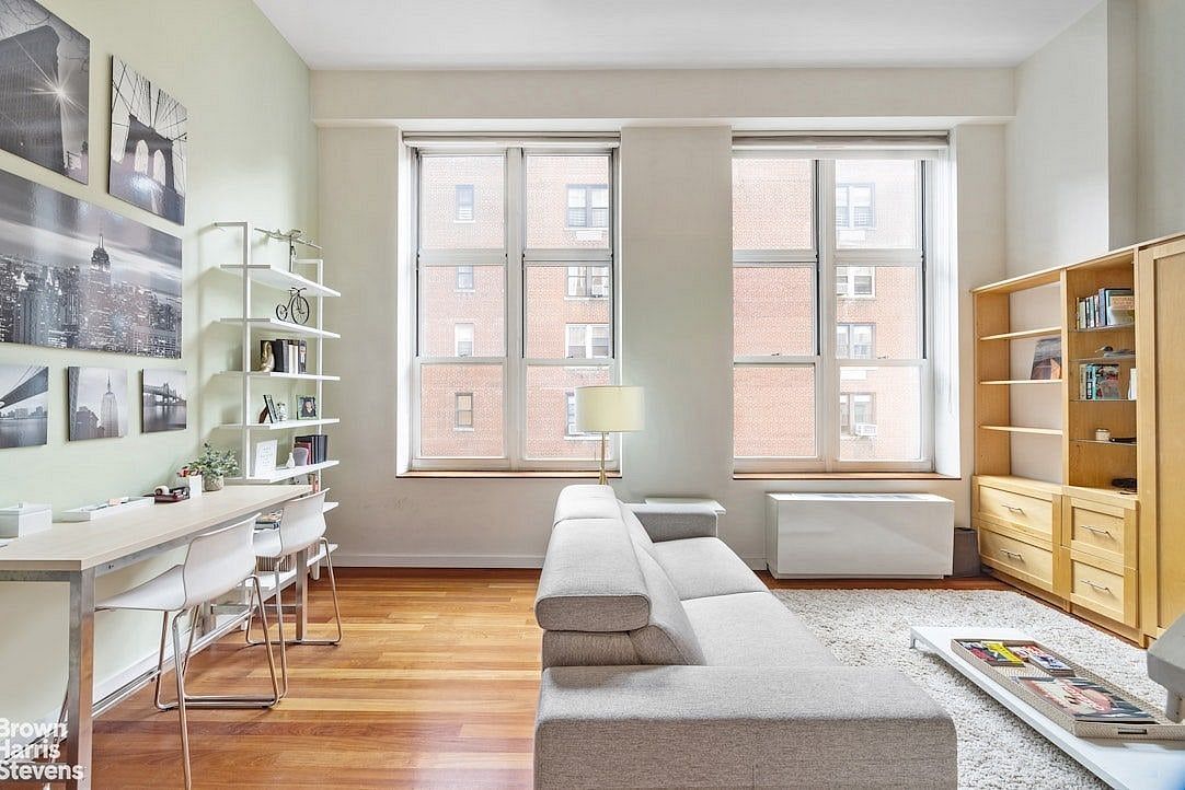A dramatic duplex one-bedroom home with double-height ceilings and enormous south-facing windows, providing wonderful light. Hardwood floors, a gracious living room with a study area and beautifully designed built-ins, including a custom queen-size Murphy bed that allows the residence to comfortably sleep four. The open kitchen features stainless steel appliances, while the bathroom offers a Bio Bidet, wall-mounted towel warmer, and an in-unit washer and dryer. A full staircase leads to the full-height bedroom, appointed with a wall-mounted TV and ample custom storage. This elegant home is being offered fully furnished, making it ideal as a turnkey residence or pied-a-terre.