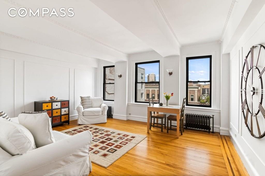With its wall of north-facing windows, the spacious living/dining room is bathed in sunshine all day and twinkling city lights at night. Pre-war details abound, from the high beamed ceilings and entry arch to the original hardwood floors in excellent condition and picture frame wall moldings.