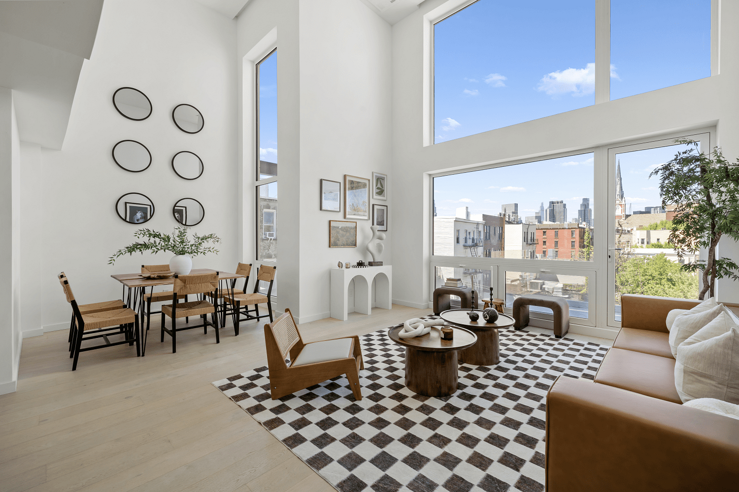 Bathed in light and designed with intention, this three-bedroom, two-bathroom duplex penthouse at 123 Meserole Avenue offers a rare blend of architectural scale, functional luxury, and seamless indoor-outdoor living.