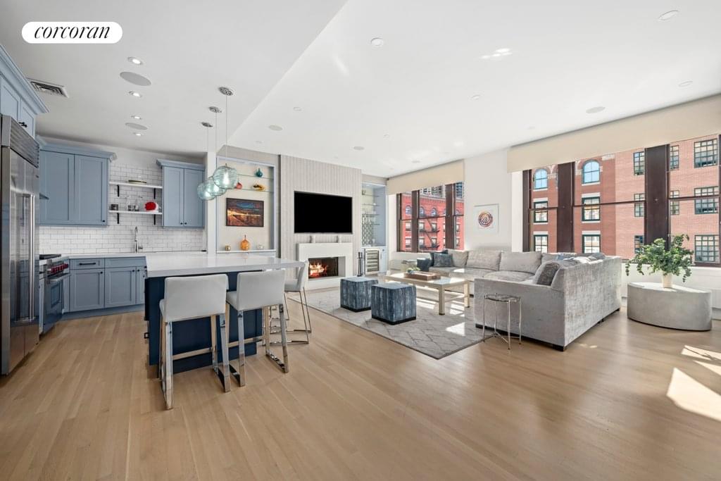 Inside this 2,473-square-foot sanctuary, you'll find an expansive, thoughtful layout perfect for lavish entertaining and busy daily life. Ten-foot-tall ceilings soar above pale hardwood floors, stunning designer wallcoverings and lighting, and oversized windows on the western and eastern exposures. The spacious foyer welcomes you with a roomy coat closet, a chic powder room and plenty of space for a home office area. Ahead, the sprawling great room sets the stage for large gatherings with a lovely dining area topped by a gorgeous blue glass bubble chandelier. The living room draws you in with open-sky views over the historic Tribeca streetscape, a wood-burning fireplace and walls of custom built-ins. Refreshments are within easy reach thanks to a bar area with mirrored tile, glass shelving and a wine refrigerator. Plan your next culinary masterpiece in the impressive open kitchen filled with pale blue custom cabinetry, crisp white countertops, classic subway tile backsplashes and upscale stainless steel appliances, including a vented Wolf range, Sub-Zero refrigerator and a Bosch dishwasher. Serve casual meals at the massive center island/breakfast bar, or retreat to the terrace off the entry for after-dinner drinks or morning coffee overlooking the building's verdant courtyard.
