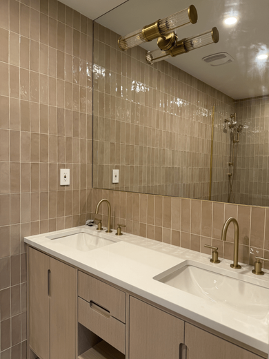The first full bathroom off the living room boasts a sage green Zellige-inspired wall tile that pairs wonderfully with the brushed nickel hardware and fixtures, anchored by a neutral wooden vanity.