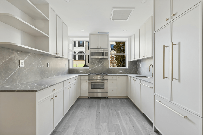 The kitchen is truly the pinnacle of this residence - showcasing lustrous off-white cabinetry paired with sleek yet sultry dark marble countertops providing an abundance of counter space and storage. Polished yet understated, the gold hardware adds a timeless touch to the cabinets, seamlessly complementing the kitchen fixtures. This chef's kitchen comes equipped with all top-of-the-line Fisher Paykel appliances including a gas range, vented microwave, and a paneled, French door refrigerator and dishwasher.