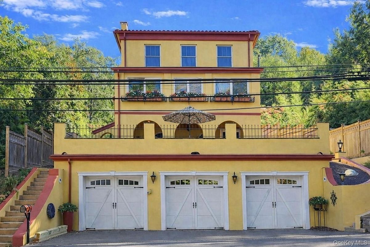 Summer is coming get ready !! This Mediterranean style home with waterviews has 4 bedrooms and 3 bathrooms, along with a 3-car attached garage — with the third garage currently serving as mechanical and storage space. Just moments from your own private Oyster Bay Cove beach, which includes beach and mooring rights, kayak racks, and parking. As you enter the property, you are greeted by a large front patio with arches reminiscent of Mediterranean design. This space is ideal for outdoor living and offers lovely water views of Oyster Bay Harbor on each level of the home . The stunning living room and dining area feature arched windows and an imported wood-burning fireplace that continues the Mediterranean style. The expansive eat-in kitchen is equipped with stainless steel appliances and granite countertops, making it a chef's delight. The kitchen also has direct access to a large outdoor brick patio, perfect for enjoying complete privacy. Be amazed by the second-floor great room and office/den area, featuring a wall of windows overlooking Oyster Bay Harbor. This level also includes two additional bedrooms, a full bath, and a laundry room. One of the bedrooms has its own separate outdoor entrance, making it ideal for guests. The third floor is dedicated to the primary bedroom suite, which includes a full bath, an additional hall bathroom, a spacious walk-in closet, and a bonus room that could serve as an office or additional bedroom. This home is equipped with central air conditioning, central vacuum, and hardwood floors. The well-maintained grounds include a brick patio in the backyard, providing ample space for gatherings — an entertainer's paradise both inside and out. Additionally, you are just a short drive from the historic Town of Oyster Bay, with its delightful shops and restaurants, beautiful town beaches, and boating opportunities. Enjoy hiking trails at Sagamore Hill, the former home of Theodore Roosevelt. Make this your summer home retreat or your year round home!