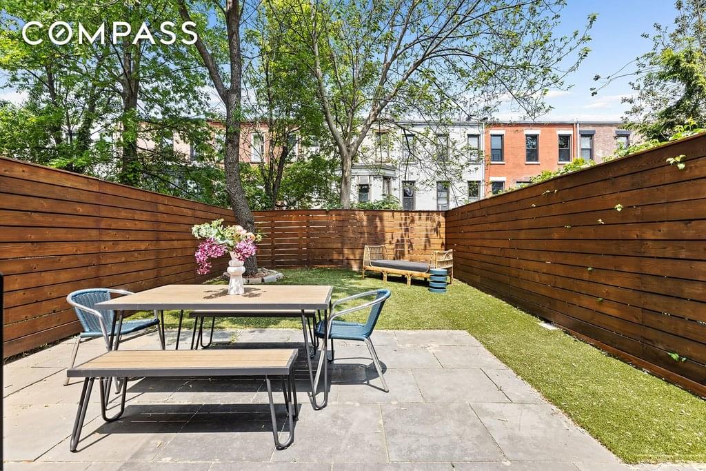 The stellar garden is accessed via a series of single-paned glass French doors which run the length of the kitchen. A handsome wood deck extends to the house's private green spacecomplete with turf, slatted wood fencingand a large, well-established tree. Worth noting is the wonderful openness of this green oasiswith gardens on all sides and only other low-rise buildings on the block, this garden is the townhouse beau ideal: a sunny green space with plentiful light from all directions, open lines of sight, and lots and lots of blue sky.