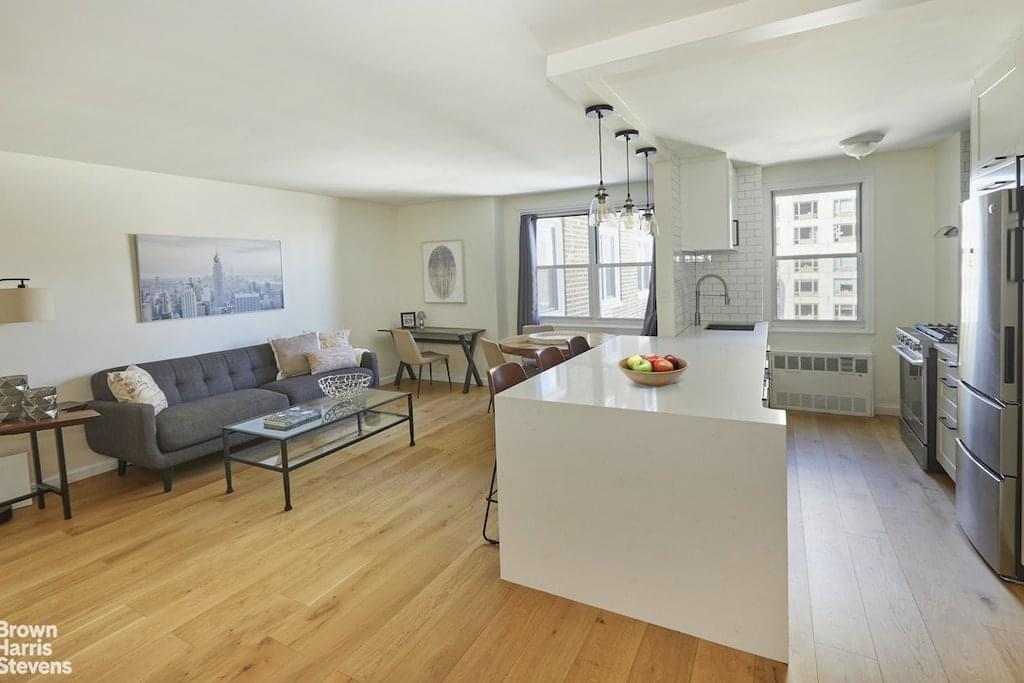 Apartment 12J has bright and sunny open views to the north, a new open-concept kitchen, wide-plank hardwood flooring throughout, a large built-in wardrobe storage unit in the bedroom and an entry foyer with two closets.