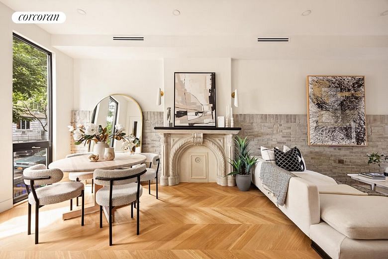 At the stop of the stoop is a dreamy parlor floor with soaring ceiling heights, exposed whitewashed brick walls, and a decorative stone mantle, the perfect embodiment of the building's historic past. In conjunction with the warmth of the old is a magnificent and truly original chef's kitchen custom built into a windowed back extension with easy access to your living and dining areas. A combination of professional appliances including a 6-burner Wolf range, Wolf speed oven, Wolf built-in coffee maker, Sub Zero fridge, and Bosch dishwasher are juxtaposed with lush cream custom wood cabinetry, a deep soaking sink, exposed shelving for reachability, a brass faucet and sprayer, and a custom clad range hood. A suite of brass and cream designer lighting fixtures co-exist with brass hardware throughout, creating a warm and timeless feel for both hosting guests and daily dining. Indulge your love of cooking while gazing through an arched floor-to-ceiling glass door with birds-eye views of your spacious and verdant garden. And don't miss the show-stopping powder room on this floor, clad in custom wood paneling, with an exquisite Calacatta Violetta sink, and unlacquered brass fixtures....