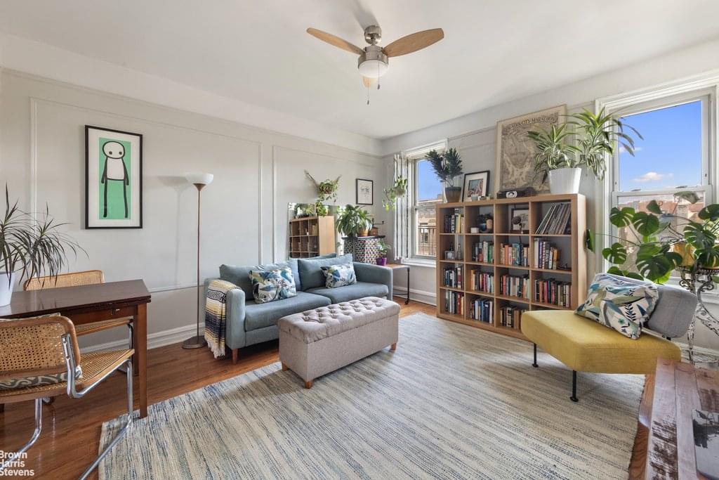 Beautiful light streams in the morning and the afternoon sun fades into a cozy glow. Sky and tree views. Apt. 6G is a rare quiet corner top floor split 2-bedroom. High ceilings, great windows, and warm wooden floors. Stylishly renovated bright kitchen has hardwood open shelving, original cast iron double sink, butcher block counter, and Portuguese inspired floor tiles. Dumbwaiter has been reconfigured into a floor to ceiling pantry for extra storage. The smartly updated windowed bath retains the historic charm of a 1920s home with subway tiles and marble hexagon tiles. Cast Iron bathtub has been lovingly cared for and is in excellent condition. Primary king sized bedroom is generous and overlooks the gardens on 138th Street. Second bedroom is large enough for a queen sized bed or great home office. Ceiling fans, and ample closet space throughout. Apt. 6G meshes the best of both pre-war and postwar with picture molding, and original brass door hardware. Holstein Court was built in 1929 and has a two beautiful outdoor spaces for socializing and gardening. Solar roof-panels, weekly compost collection, and textile and electronics recycling in the basement. Also: laundry room, bike storage, and a community room as well as package storage for deliveries. Wonderful live-in super and daily Porter. Across the Boulevard from Strivers Row, next-door to the historic Abyssinian Baptist Church, Holstein Court is close to St. Nicholas Park, City College, Harlem Hospital, the Schomburg Center, the Harlem YMCA and iconic Harlem favorites like Red Rooster, Ponty Bistro, The Shrine, Harlem Nights, Harlem Hops, and the 125th shopping corridor. Between the B,C and 2,3 Subways, many bus-lines, the FDR and Harlem River Drive. Holstein Court is a very well-managed HDFC co-op. 120% AMI income restrictions apply. 2023 income caps are $112,080 for one person, $128,160 for two, $144,120 for three, and $160,080 for four.