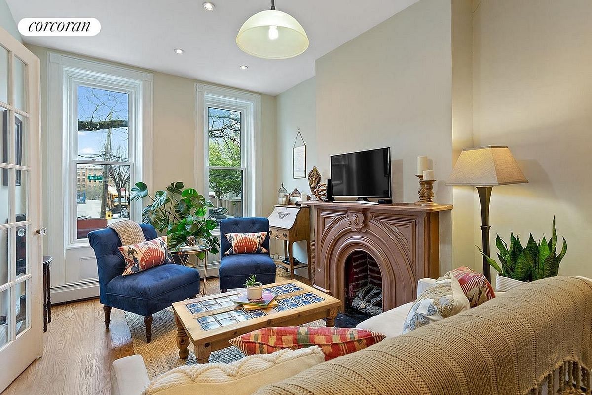 The parlor floor features soaring ceilings and a natural flow between the living room, dining area, and kitchen-creating a layout that feels both open and functional. Two original fireplaces anchor the space with warmth and character.