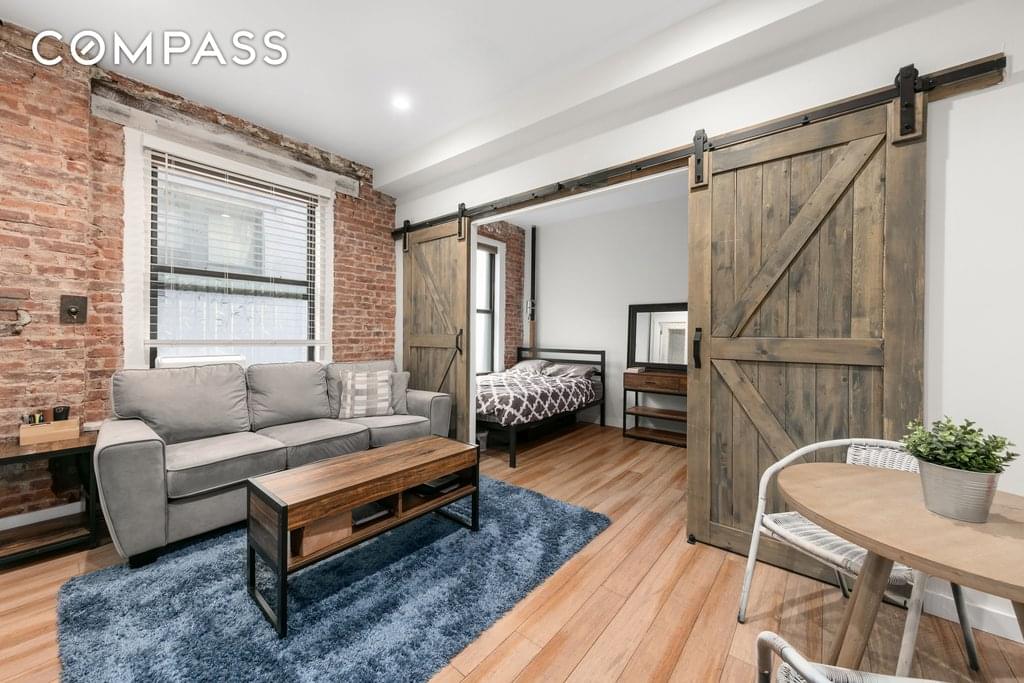 The bedroom is separated by sliding barn doors and offers a spacious built-in closet. There is a modern renovated bathroom with steam system! bluetooth speaker, and smart lighting.