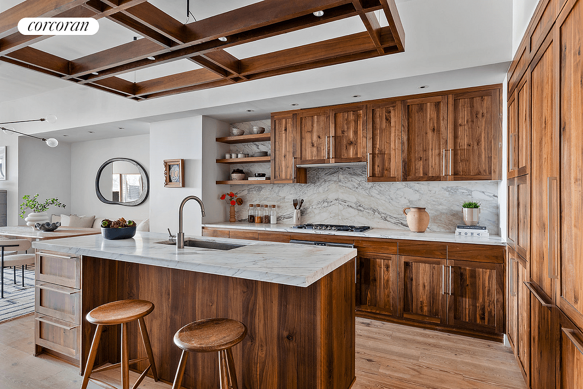 Upon entering this impeccably maintained home, you are welcomed by a gracious foyer, complete with a coat closet and an elegant marble-clad powder room. The open-concept Pedini walnut kitchen is a chef's dream, featuring Gaggenau appliances, a wine refrigerator, and striking Calacatta Tucci marble countertops, island, and backsplash.