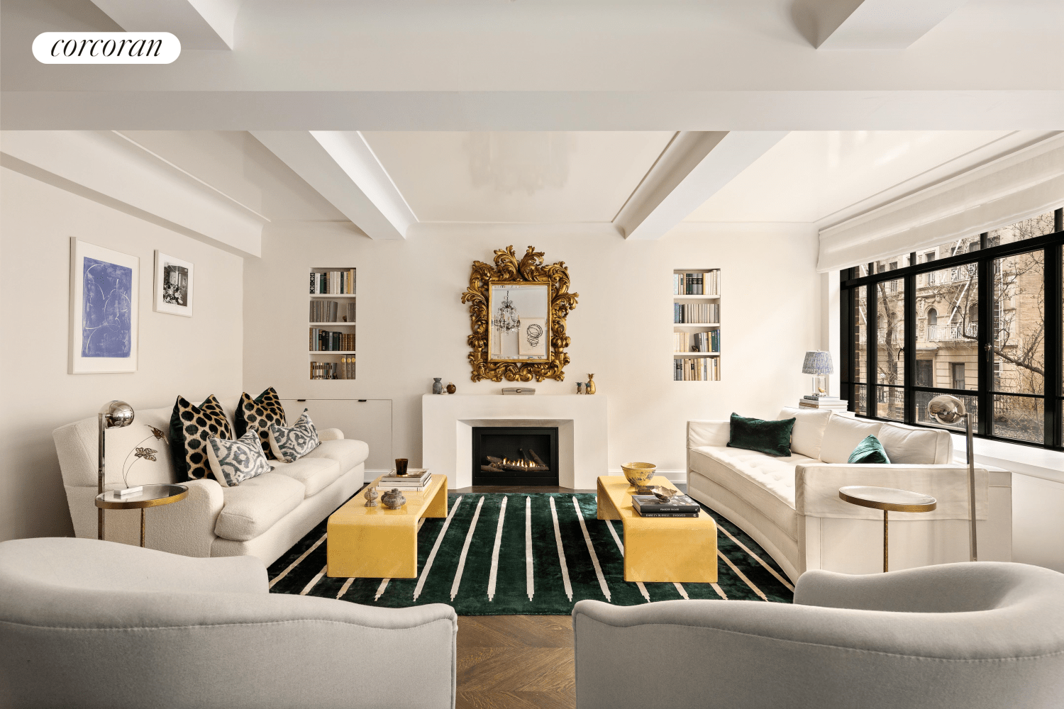 Upon entry, you're greeted by the foyer and a wide gallery that elegantly separates the public and private areas of the home, with a walk-in coat closet and a conveniently located powder room. To the left, the expansive living and dining room designed by AD100 designer Virginia Tupker is an ideal space for both entertaining and intimate dinners. Natural light pours into the living room through oversized Art Deco casement windows, highlighting the lacquered ceilings and the stunning chevron-patterned oak floors. The entire home features beautiful views of the Brownstones and the mature trees that adorn West 12th Street.