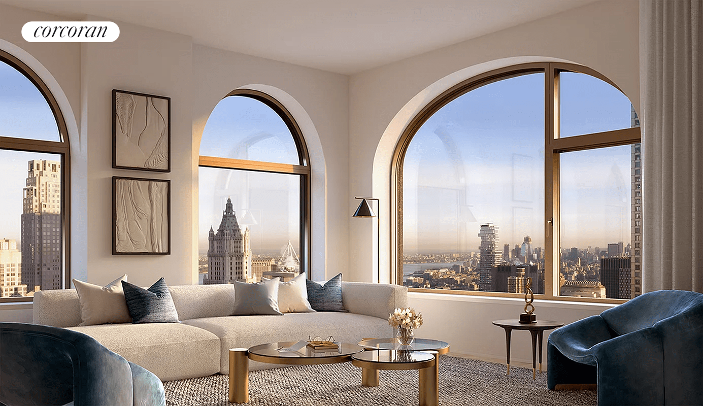Residence 42E is a corner three bedroom, three bathroom home with approximately 10 foot ceilings and oversized arched windows with elegant bronze detailing framing expansive New York City skyline views. Interior finishes include wide-plank white oak flooring and oil rubbed bronze fixtures custom designed by Sir David Adjaye. The residence boasts an open kitchen with custom Pedini Italian textured blackened oak cabinetry, Salvatori Pietra Cardosa marble countertops and backsplash hand-selected from the Apuan Alps in Tuscany with a Salvatori Nero Marquina cantilever providing additional seating, and state-of-the-art appliances by Gaggenau, Bosch, and Thermador, including wine storage. The master bedroom suite has a generous walk-in closet and a luxuriously appointed bathroom with textured Italian Bianco Carrara marble, a custom Pedini Italian millwork double vanity, an expansive shower and 6-foot soaking tub, and radiant heated floors. There are two generous secondary bathrooms in the residence with custom Pedini Italian millwork vanities, one complete with Salvatori Grigio Versilia marble throughout and a soaking tub, the other with Salvatori Bianco Carrara marble throughout and a shower. The second bedroom is easily convertible into a library, home office, or expanded living area.