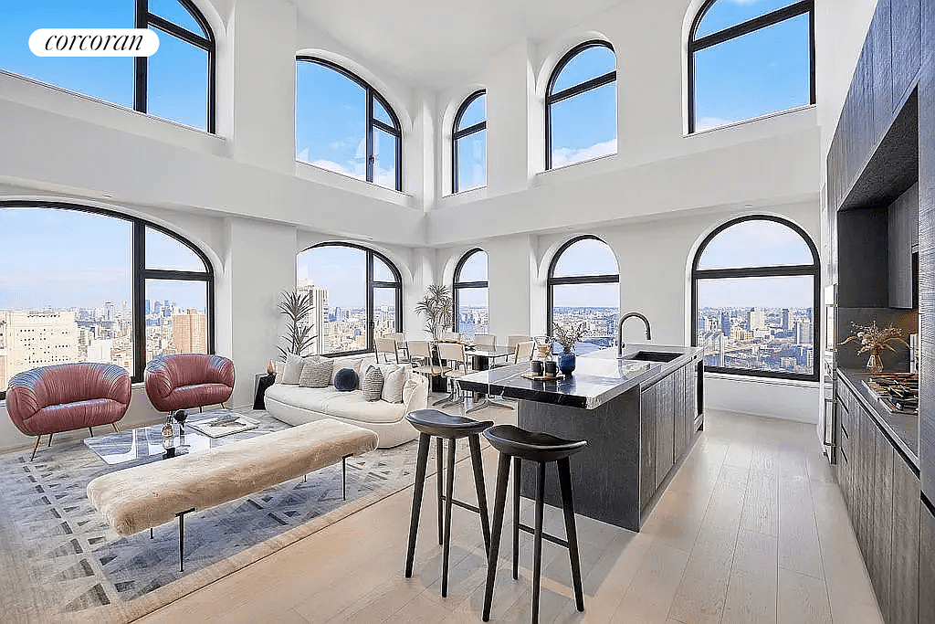 Residence 46A is a four bedroom, four & a half bathroom home featuring a dramatic double-height living and dining area with soaring ceilings approaching 19 feet. Oversized arched windows with elegant bronze detailing frame panoramic river and New York City skyline views. Interior finishes include wide-plank white oak flooring and oil rubbed bronze fixtures custom designed by Sir David Adjaye. The residence boasts an open kitchen with custom Pedini Italian textured blackened oak cabinetry, Salvatori Pietra Cardosa marble countertops and backsplash hand-selected from the Apuan Alps in Tuscany with a Salvatori Nero Marquina cantilever providing additional seating, and state-of-the-art appliances by Gaggenau and Thermador, including a double oven and wine storage. The corner primary bedroom suite has a generous walk-in closet and a luxuriously appointed bathroom with textured Italian Bianco Carrara marble, a custom Pedini Italian millwork double vanity, an expansive shower and 6-foot soaking tub, and radiant heated floors. There are three generous secondary bathrooms in the residence with custom Pedini Italian millwork vanities and either a soaking tub or expansive shower, two complete with Salvatori Grigio Versilia marble throughout and the other with Salvatori Bianco Carrara marble throughout. The third bedroom is easily convertible into a library or home office. The residence opens upon a generous formal gallery with a powder room featuring floor-to-ceiling Salvatori Italian Grigio Versilia marble with a textured bamboo finish and a Salvatori Italian walnut sink with a Grigio Versilia stone basin. A separate utility room offers a washer, dryer, and sink.