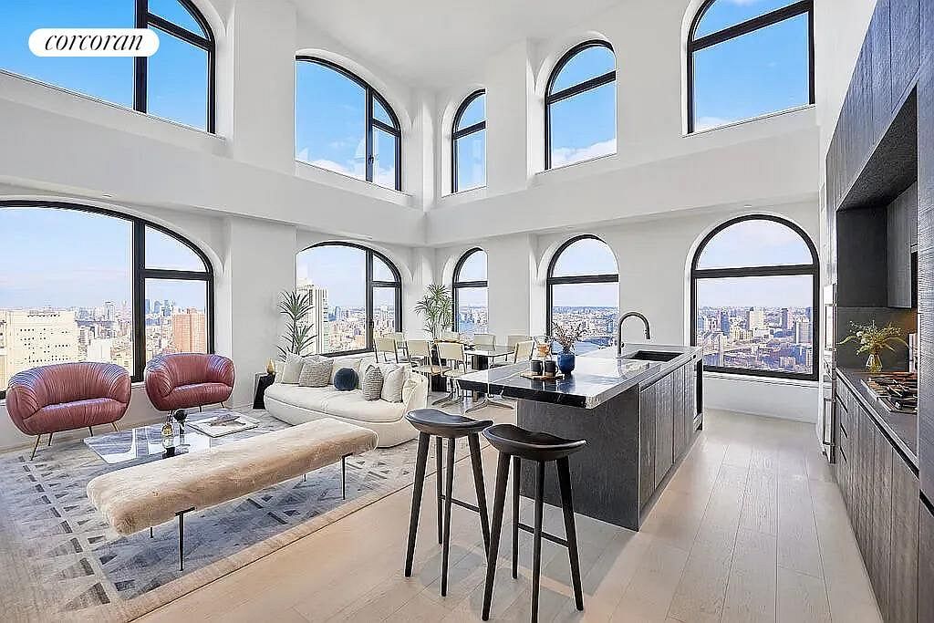 Residence 50A is a four bedroom, four and a half bathroom home featuring a dramatic double-height living and dining area with soaring ceilings approaching 19 feet. Oversized arched windows with elegant bronze detailing frame panoramic river and New York City skyline views. Interior finishes include wide-plank white oak flooring and oil rubbed bronze fixtures custom designed by Sir David Adjaye. The residence boasts an open kitchen with custom Pedini Italian textured blackened oak cabinetry, Salvatori Pietra Cardosa marble countertops and backsplash hand-selected from the Apuan Alps in Tuscany with a Salvatori Nero Marquina cantilever providing additional seating, and state-of-the-art appliances by Gaggenau and Thermador, including a double oven and wine storage. The corner primary bedroom suite has a generous walk-in closet and a luxuriously appointed bathroom with textured Italian Bianco Carrara marble, a custom Pedini Italian millwork double vanity, an expansive shower and 6-foot soaking tub, and radiant heated floors. There are three generous secondary bathrooms in the residence with custom Pedini Italian millwork vanities and either a soaking tub or expansive shower, two complete with Salvatori Grigio Versilia marble throughout and the other with Salvatori Bianco Carrara marble throughout. The third bedroom is easily convertible into a library or home office. The residence opens upon a generous formal gallery with a powder room featuring floor-to-ceiling Salvatori Italian Grigio Versilia marble with a textured bamboo finish and a Salvatori Italian walnut sink with a Grigio Versilia stone basin. A separate utility room offers a washer, dryer, and sink.