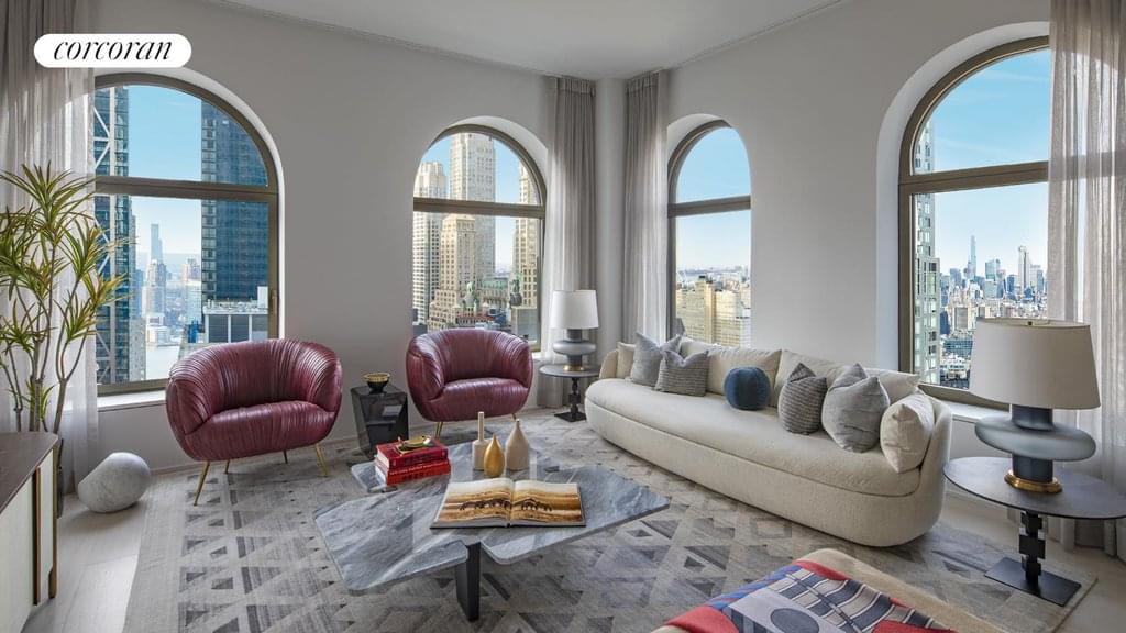 Residence 50D is a corner three bedroom, three bathroom home with approximately 10 foot ceilings and oversized arched windows with elegant bronze detailing framing expansive New York City skyline views. Interior finishes include wide-plank white oak flooring and oil rubbed bronze fixtures custom designed by Sir David Adjaye. The residence boasts an open kitchen with custom Pedini Italian textured blackened oak cabinetry, Salvatori Pietra Cardosa marble countertops and backsplash hand-selected from the Apuan Alps in Tuscany with a Salvatori Nero Marquina cantilever providing additional seating, and state-of-the-art appliances by Gaggenau, Bosch, and Thermador, including wine storage. The corner primary bedroom suite has a generous windowed walk-in closet and a luxuriously appointed windowed bathroom with textured Italian Bianco Carrara marble, a custom Pedini Italian millwork double vanity, an expansive shower and 6-foot soaking tub, and radiant heated floors. There are two generous secondary bathrooms in the residence with custom Pedini Italian millwork vanities, one complete with Salvatori Grigio Versilia marble throughout and a soaking tub, the other with Salvatori Bianco Carrara marble throughout and an expansive shower. The second bedroom is easily convertible into a library, home office, or expansion of the living area or primary suite.