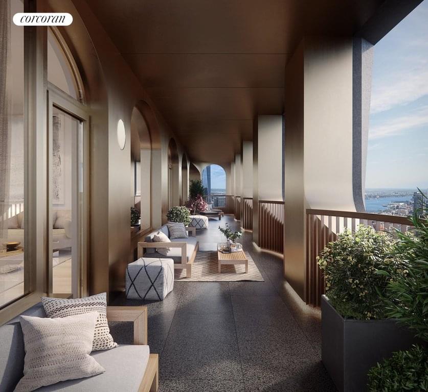 Penthouse 60B is a three bedroom, three-and-a-half bathroom home featuring ceilings up to 11 feet and a generous private outdoor space. Oversized arched windows with elegant bronze detailing frame panoramic river and New York City skyline views with all four exposures. The outdoor loggia spans the full width of the residence, reaching nearly 80 feet. Interior finishes include wide-plank white oak flooring and oil rubbed bronze fixtures custom designed by Sir David Adjaye. The living and dining area with direct loggia access boasts an open kitchen with custom Pedini Italian textured blackened oak cabinetry with blackened steel insets, Salvatori Pietra Cardosa marble countertops and backsplash hand-selected from the Apuan Alps in Tuscany with a Salvatori Nero Marquina cantilever providing additional seating. State-of-the-art appliances by Gaggenau and Thermador include a fully-vented hood, double oven, and wine storage. The corner primary bedroom suite enjoys direct loggia access, two walk-in-closets, and a luxurious bathroom with textured Salvatori Italian Bianco Carrara marble with a Grigio Versilia slab wainscot, carved stone 6-foot soaking tub with skyline views, carved stone sinks, separate water closet, and oversized shower. There are two generous secondary bathrooms in the residence with custom Pedini Italian millwork vanities, one complete with Salvatori Grigio Versilia marble throughout and a soaking tub, the other with Salvatori Bianco Carrara marble throughout and an expansive shower. A powder room off of the entry foyer is designed with Grigio Versilia marble with a textured bamboo finish and a Salvatori Italian walnut sink with a Grigio Versilia basin. A separate utility room offers a washer, fully-vented dryer, and sink.