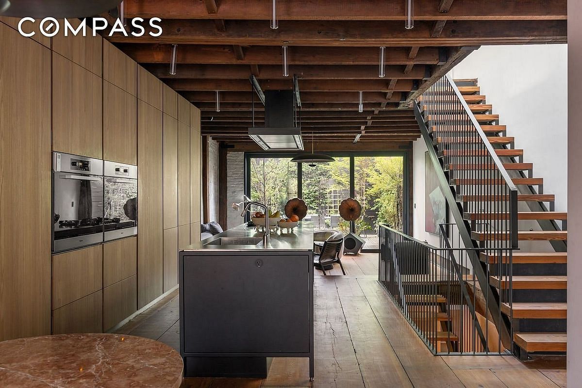 Walk through the double-doored foyer and the house doesnt wait for you to ask: light drops straight down from two passive solar warehouse skylights onto original beamed ceilings and wide-plank floors, pulling you past a 12-foot Vipp island with five-burner range, a full wall of Polyform cabinetry with double ovens, full-sized fridge and freezer, and directly out through a glass rear wall into a garden that makes you forget youre in Brooklyn.
