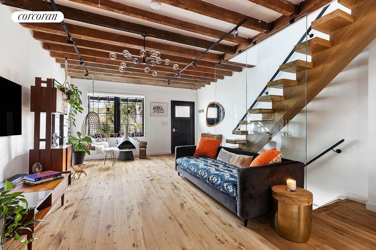 Natural light fills every room through oversized casement windows, framing tranquil views of lush gardens and the park's tree canopy. Recently gut-renovated, the home showcases reclaimed wide-plank oak floors, soaring ceilings with exposed beams, and a striking floating staircase. The parlor level is designed for both everyday living and effortless entertaining, featuring an open-plan layout with dual exposures, a sleek chef's kitchen with high-end appliances, a farmhouse sink, and custom shelving-all flowing seamlessly out to a sunlit deck and landscaped garden.
