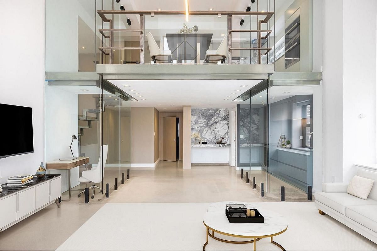 The sun streams into the south/east facing living room with its double height ceilings. Glass walls divide the wet bar with its wine fridge and sleek counters and the convenient home office.