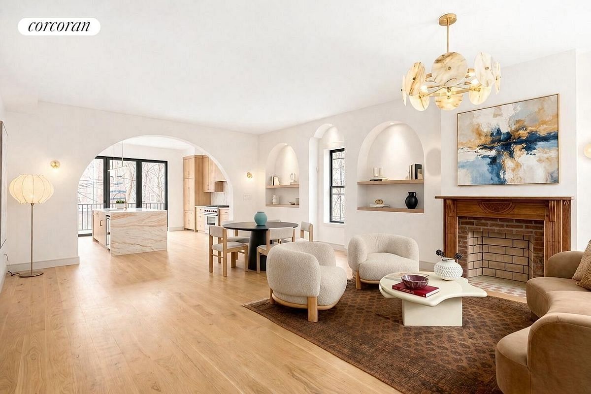 Beyond a striking vestibule, an original newel post and new custom railing set the tone. Wide-plank white-oak floors flow throughout, and arched openings create graceful transitions between spaces.