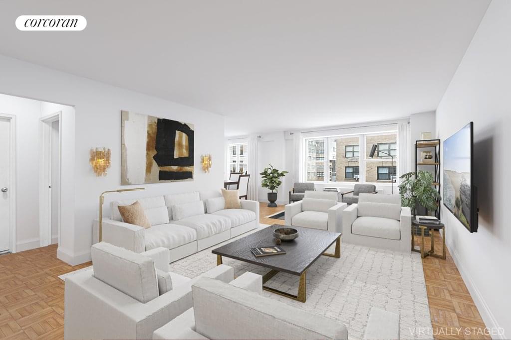 Large 2-bedroom, 2-bathroom home of approximately 1,475 sq. ft. which can be easily converted to a 3-bedroom home. The expansive living room with large dining alcove makes it a great space for entertaining. The dining room affords enough space to add a 3rd bedroom or home office. The king-sized primary bedroom is super spacious with an ensuite bathroom and 3 large and deep walk-in closets. The second bedroom offers enough space for a queen-sized bed plus office area. The flexible layout with abundance of closet space allows you to further create your dream home by adding your custom design to the windowed kitchen and bathroom. Plus, washer/dryer is permitted with Board approval. This is an opportunity for the smart buyer to build equity - a truly unique find in the heart of Midtown just off of Park Avenue.