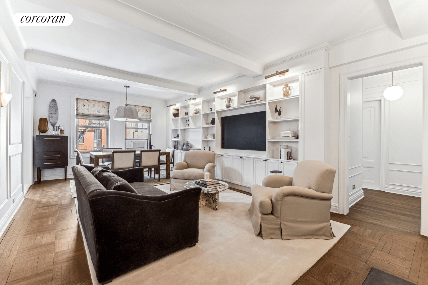 This meticulously renovated, corner two-bedroom residence seamlessly blends pre-war charm with modern luxury in the coveted West Village. Bathed in abundant natural light from both east and north exposures, the home is thoughtfully designed with exquisite details, offering the perfect balance of warmth and sophistication. A gracious foyer, featuring classic wainscoting and an English countryside mural, sets the tone for this one-of-a-kind home. Beyond, the living room serves as the centerpiece, showcasing a renovated wood-burning fireplace adorned with Pietra Cardosa marble and custom wall-to-wall millwork. Soft picture lighting illuminates the open shelves, creating a refined yet inviting atmosphere-ideal for both intimate evenings and lively gatherings.