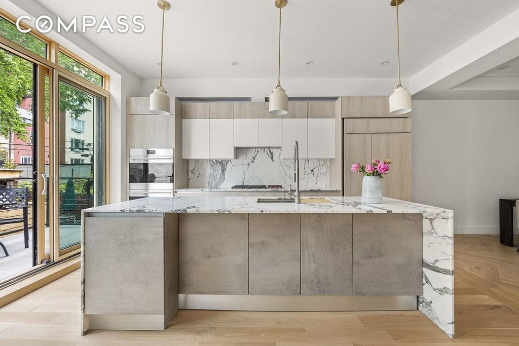 The open concept parlor floor features a striking marble mantle, an open dining area demarcated with prewar-inspired ceiling moldings, and a sleek Scavolini chef's kitchen equipped with high-end Wolf appliances and a panel-hidden Subzero fridge. The large deck off the kitchen, accessed via sliding glass doors, leads down to a modern and paved garden that is perfect for outdoor entertaining and relaxation.